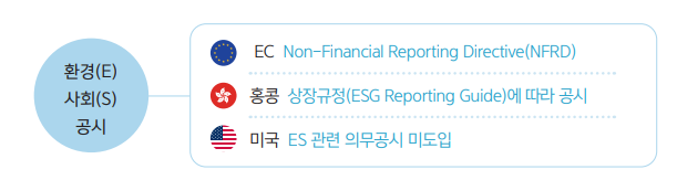 EU는 비재무정보보고지침을 만들어 회원국들의 입법을 통해 규제화한다. 홍콩은 모든 상장회사가 사업보고서나 별도보고서 등을 통해 E, S상황을 공시한다. 미국은 아직까지 는 자율공시형태로 운영되고 있다.