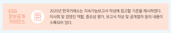 지속가능보고서는 기업이 자발적으로 자사의 ESG 준수상황을 작성하여 공시하고 있다. 발간 기업은 2017년 103개에서 2020년 48개사로 점차 감소 추세에 있다. 반면 한국거래소에 자율 공시 형태로 제출하는 상장회사는 2017년 8개사에서 2020년 40개사로 증가 추세다.
