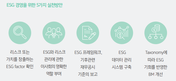 중소·중견기업이 지속가능하려면 미래경쟁력을 키운다는 관점에서 ESG 리 스크를 관리하고 저탄소 경제 체제를 고려한 장기적인 목표를 수립하여야 한 다. 그리고 그곳에서 기회요인을 찾아 적극적으로 실천하고 비즈니스 모델을 개선하는 노력이 필요하다.