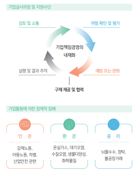 우리 기업의 인권·환경 경영 수준을 구체적으로 진단하기 위하여 몇 가지 기업실사지침 및 협력업체 이행지침을 활용하면 좋다. 대표적으로는 OECD 의 기업책임경영을 위한 기업실사지침, UN의 기업과 인권이행지침이 있다. 그 외에도 국가인권위원회의 인권경영 가이드라인, UN글로벌콤팩트의 기 업과 인권지침서 실사가이드라인도 참고하면 좋다.