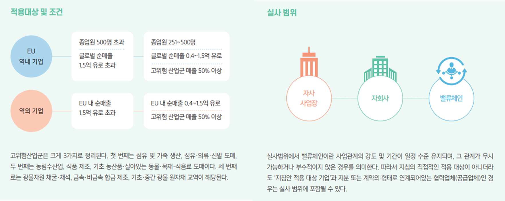 2022년 2월 23일, EU집행위원회는 공급망 실사를 의무화하는 ‘지속가능 한 공급망 실사에 관한 지침안(Directive on corporate sustainability due diligence)’을 공식적으로 발표하였다. EU집행위원회의 지침안은 EU의회 와 EU이사회의 승인을 거쳐 최종 발효되며, 각 EU회원국은 발효 후 2년 이 내에 국내법으로 전환하여 적용해야 한다.