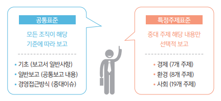 GRI에는 공통적으로 보고해야 할 3개의 공통표준과 선택적으로 보고할 수 있는 34개의 특정주제표준으로 구성된다.