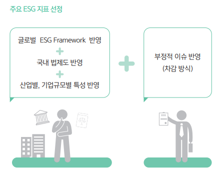 ESG 평가의 핵심지표는 GRI, TCFD, CDP, CDSB, IIRC, UN SDGs, OECD 지배구조 가이드라인 등 글로벌 평가사의 주요 이니셔티브가 준용된다. 그 리고 선정된 매트릭스 가운데에서 국내 법제도, 산업·기업별 특성을 반영 하여 ESG 평가지표와 지표별 가중치를 결정하고 이를 합산해 점수를 산정 한다. 이 때 부정적 이슈가 발생할 경우, 점수에게 차감되는 방식으로 평가 되는 것이 일반적이다.