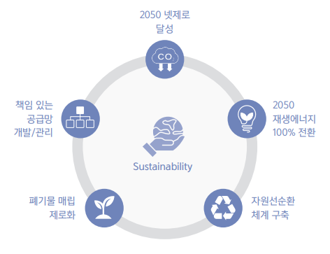 지속가능한 성장을 위하여 도출된 핵심과제는 9가지이며 각 과제에 대한 목표를 설정하고 실행해나가고 있다. 특히 모든 핵심과제는 투자뿐 아니라 R&D, 제품생산, 사용, 폐기에 이르는 모든 과정이 전 밸류체인에서 실행되 어야 한다는 점이 강조된다.