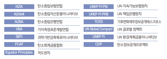 1992년 설립된 UN환경계획 금융이니셔티브로서 '22년 6월 현재 전세계 500여개 금융회사들이 참여중이며, 신한금융그룹은 UNEP FI 최고협의회인 '리더십위원회'의 아시 아 유일 멤버 및 '글로벌 운영위원회'의 아시아-태평양 뱅킹 부문 대표로도 참여하고 있다.